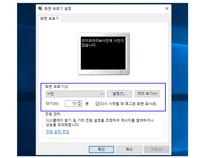 1. 화면 보호기 설정에서, 화면 보호기 부분 확인할 것.