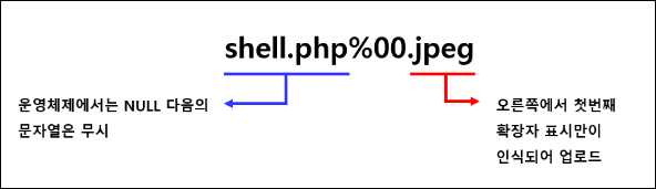 예로 shell.php 업로드를 위해 shell.php%00.jpg 로 확장자를 변경해주면 shell.php 파일이 인식되게 된다.